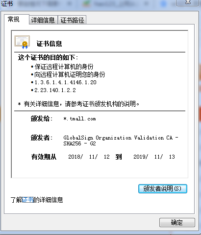 我们可以用Chrome浏览器打开taobao网站看看,当我们点开地址栏的锁时可以发现,我们输入的是taobao.com的网站,结果证书却是颁发给天猫的(*.tmall.com),也就是说它的证书的名字和要访问的网站的名字竟然对不上,那我们一定会想这个网站安全吗?