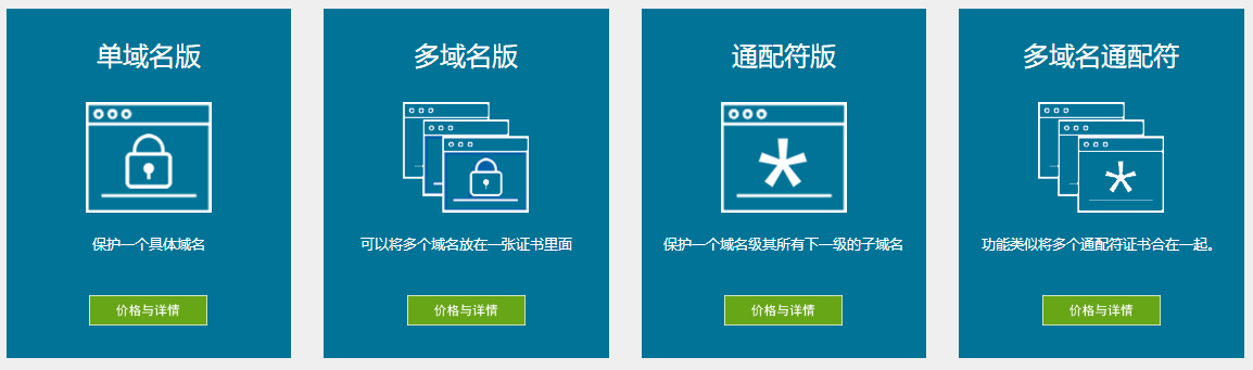 具体可分为:单域名SSL证书,多域名SSL证书、通配符证书。保护的域名数量越多,价格越贵。