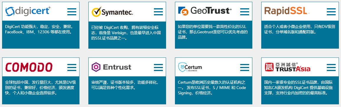 而Geotrust、Comodo(现已更名为Sectigo)、Thawte,Certum 以及 RapidSSL,则价格更加亲民,使得小微企业也能以较低成本实现全球可信的 https 加密。