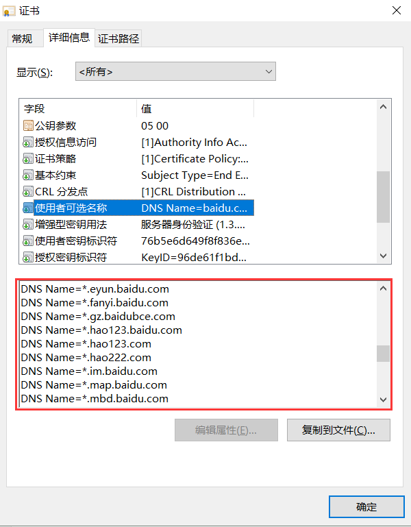 3.其实在百度的这张证书里面还包含了具体的单域名,因为截图的关系,感兴趣的朋友可以直接打开百度网站点击查看;