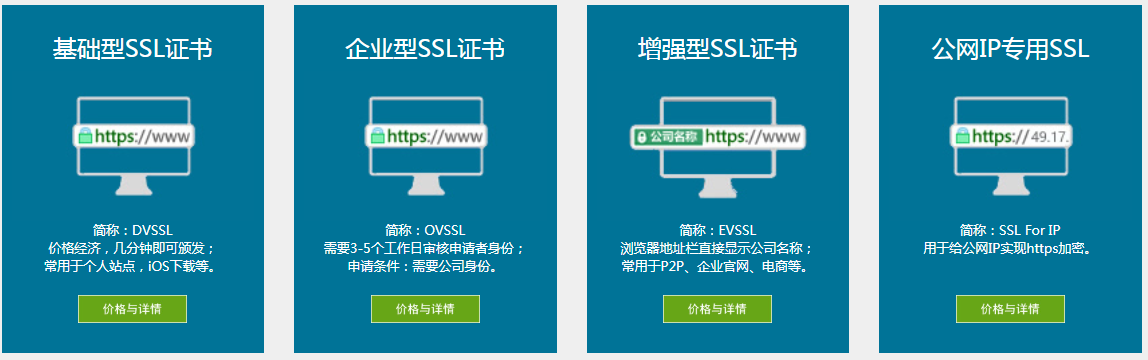 SSL证书根据验证级别分为三种类型:域名型SSL证书,简称DVSSL;企业型SSL证书,简称OVSSL;增强型SSL证书,简称EVSSL。不同类型的证书审核内容不一样,所需要准备的材料也不一样。
